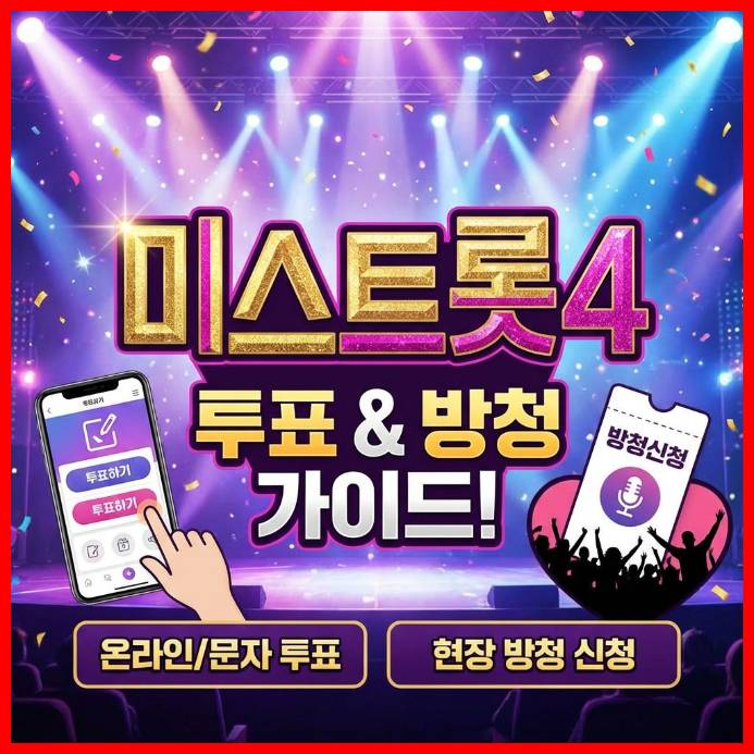 대한민국 트로트 역사를 새로 쓸 '미스트롯4'의 막이 곧 오릅니다. 당신이 사랑하는 가수를 트로트 여왕으로 만들고 싶다면, 이 글을 놓치지 마세요! 미스트롯4 투표방법부터 현장의 열기를 직접 느낄 수 있는 미스트롯4 방청신청 꿀팁까지, 복잡한 정보 속에서 헤매지 않고 핵심만 쏙쏙 뽑아 완벽하게 정리해 드립니다. 지금 바로 '미스트롯4'의 주인공을 탄생시킬 당신의 한 표와 현장 참여 기회를 잡는 모든 노하우를 확인하고, 적극적으로 미스트롯4 투표하기에 동참하세요.